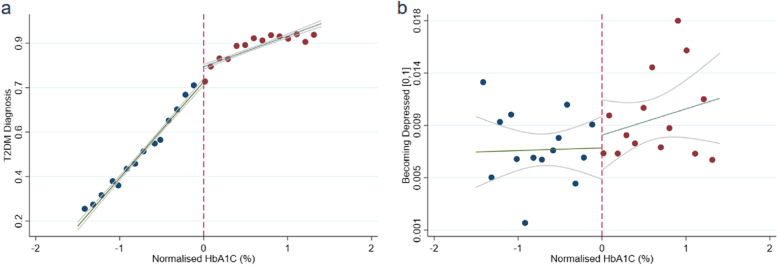 Methods: We employ a fuzzy regression discontinuity design (RDD) exploiting the exogenous cut-off value of a biomarker used to diagnose type-2 diabetes (glycated haemoglobin, HbA1c) and information on psycometrically validated measures of diagnosed clinical depression drawn from rich administrative longitudinal individual-level data from a large municipality in Spain. This approach allows estimating the causal impact of a type-2 diabetes diagnosis on clinica ldepression.