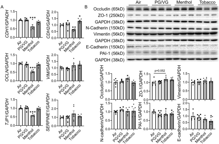 Results: After exposure, HFL-1 showed decreased cell number with increased IL-8 levels in the tobacco flavor group compared to air. BEAS-2B also showed increased IL-8 secretion after PG/VG and tobacco flavor exposure, while menthol flavor exposure showed no change. Both menthol and tobacco-flavored e-cig exposure showed decreased protein abundance of type 1 collagen (COL1A1), α-smooth-muscle actin (αSMA), and fibronectin as well as decreased gene expression level of αSMA (Acta2) in HFL-1. After tobacco flavor e-cig exposure, HFL-1 mediated wound healing and tissue contractility were inhibited. Furthermore, BEAS-2B exposed to menthol flavor showed significantly decreased gene expression of CDH1, OCLN, and TJP1.