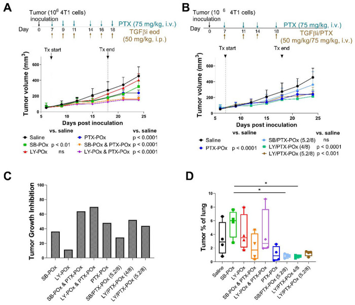 Triple-negative breast cancer (TNBC) is notoriously difficult to treat due to the lack of targetable receptors and sometimes poor response to chemotherapy. The transforming growth factor-beta (TGFβ) family of proteins and their receptors (TGFR) are highly expressed in TNBC and implicated in chemotherapy-induced cancer stemness. Here we evaluated combination treatments using experimental TGFR inhibitors (TGFβi), SB525334 (SB), and LY2109761 (LY) with Paclitaxel (PTX) chemotherapy. These TGFβi target TGFR-I (SB) or both TGFR-I&II (LY). Due to the poor water solubility of these drugs, we incorporated each of them in poly(2-oxazoline) (POx) high-capacity polymeric micelles (SB-POx and LY-POx). We assessed their anti-cancer effect as single agents and in combination with micellar Paclitaxel (PTX-POx) using multiple immunocompetent TNBC mouse models that mimic human subtypes (4T1, T11-Apobec and T11-UV). While either TGFβi or PTX showed a differential effect in each model as single agents, the combinations were consistently effective against all three models. Genetic profiling of the tumors revealed differences in the expression levels of genes associated with TGFβ, EMT, TLR-4, and Bcl2 signaling, alluding to the susceptibility to specific gene signatures to the treatment. Taken together, our study suggests that TGFβi and PTX combination therapy using high-capacity POx micelle delivery provides a robust anti-tumor response in multiple TNBC subtype mouse models.