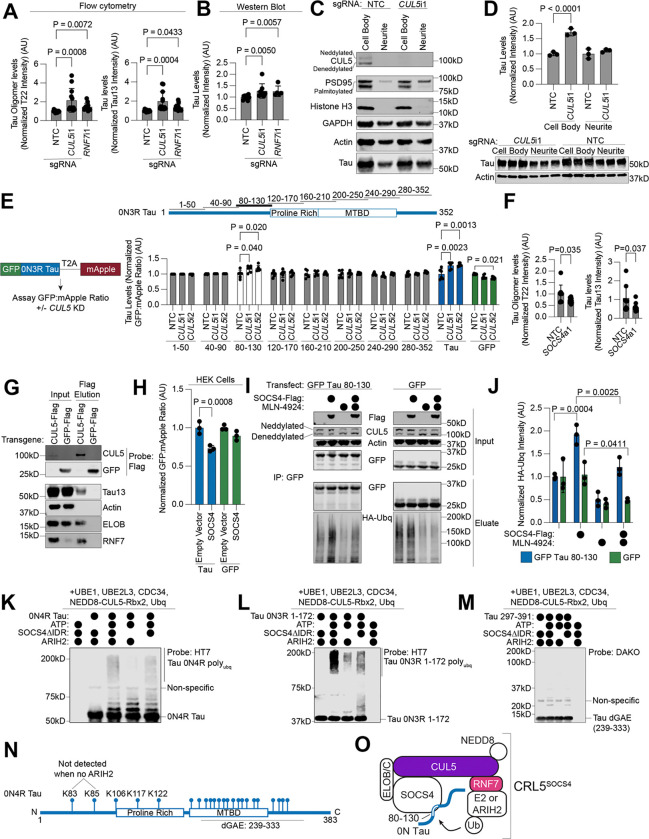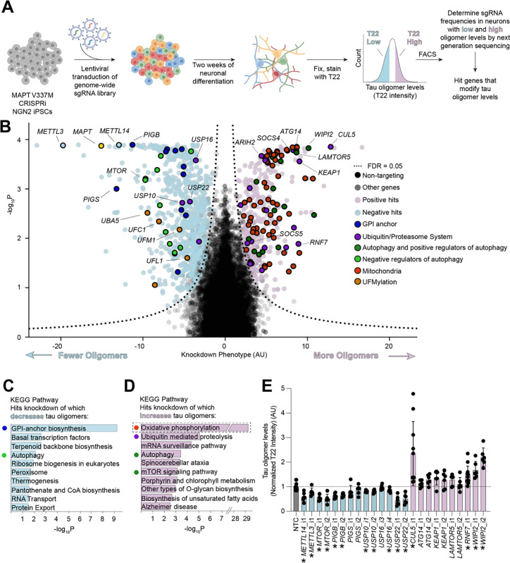 Aggregation of the protein tau defines tauopathies, which include Alzheimer's disease and frontotemporal dementia. Specific neuronal subtypes are selectively vulnerable to tau aggregation and subsequent dysfunction and death, but the underlying mechanisms are unknown. To systematically uncover the cellular factors controlling the accumulation of tau aggregates in human neurons, we conducted a genome-wide CRISPRi-based modifier screen in iPSC-derived neurons. The screen uncovered expected pathways, including autophagy, but also unexpected pathways, including UFMylation and GPI anchor synthesis. We discover that the E3 ubiquitin ligase CUL5SOCS4 is a potent modifier of tau levels in human neurons, ubiquitinates tau, and is a correlated with vulnerability to tauopathies in mouse and human. Disruption of mitochondrial function promotes proteasomal misprocessing of tau, which generates tau proteolytic fragments like those in disease and changes tau aggregation in vitro. These results reveal new principles of tau proteostasis in human neurons and pinpoint potential therapeutic targets for tauopathies.