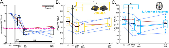 Ongoing experimental studies of subcallosal cingulate deep brain stimulation (SCC DBS) for treatment-resistant depression (TRD) show a differential timeline of behavioral effects with rapid changes after initial stimulation, and both early and delayed changes over the course of ongoing chronic stimulation. This study examined the longitudinal resting-state regional cerebral blood ow (rCBF) changes in intrinsic connectivity networks (ICNs) with SCC DBS for TRD over 6 months and repeated the same analysis by glucose metabolite changes in a new cohort. A total of twenty-two patients with TRD, 17 [15O]-water and 5 [18]-Fluorodeoxyglucose (FDG) positron emission tomography (PET) patients, received SCC DBS and were followed weekly for 7 months. PET scans were collected at 4-time points: baseline, 1-month after surgery, and 1 and 6 months of chronic stimulation. A linear mixed model was conducted to examine the differential trajectory of rCBF changes over time. Post-hoc tests were also examined to assess postoperative, early, and late ICN changes and response-specific effects. SCC DBS had significant time-specific effects in the salience network (SN) and the default mode network (DMN). The rCBF in SN and DMN was decreased after surgery, but responder and non-responders diverged thereafter, with a net increase in DMN activity in responders with chronic stimulation. Additionally, the rCBF in the DMN uniquely correlated with depression severity. The glucose metabolic changes in a second cohort show the same DMN changes. The trajectory of PET changes with SCC DBS is not linear, consistent with the chronology of therapeutic effects. These data provide novel evidence of both an acute reset and ongoing plastic effects in the DMN that may provide future biomarkers to track clinical improvement with ongoing treatment.