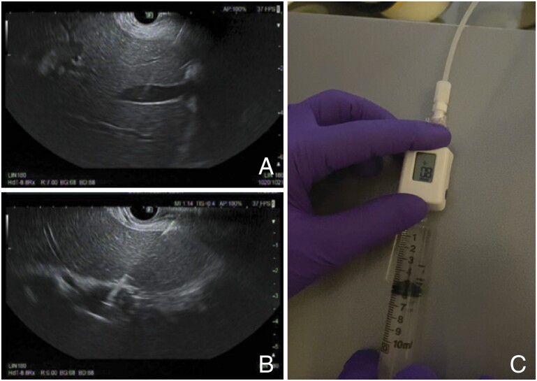 - Rogers BH, Cicurel NJ, Seed RW.. Transgastric needle aspiration of pancreatic pseudocyst through an endoscope. Gastrointest Endosc 1975;21:133–4. - PubMed