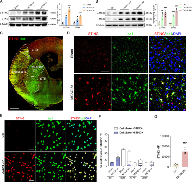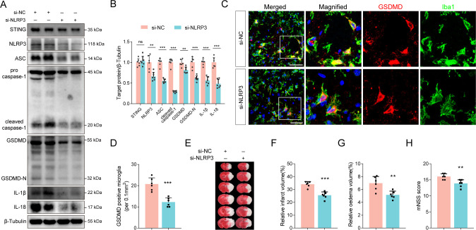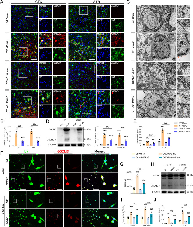 Results: STING expression was increased after MCAO and mainly detected on microglia. STING deletion alleviated brain infarction, neuronal damage and neurobehavioural impairment in mice subjected to MCAO. STING knockout suppressed microglial activation and the secretion of inflammatory chemokines, accompanied by mitigation of microglial pyroptosis. Specific upregulation of microglial STING by AAV-F4/80-STING aggravated brain injury and microglial pyroptosis. Mechanistically, co-immunoprecipitation showed that STING bound to NLRP3 in microglia. Supplementation of NLRP3 siRNA reversed AAV-F4/80-STING-induced deterioration of microglial pyroptosis.