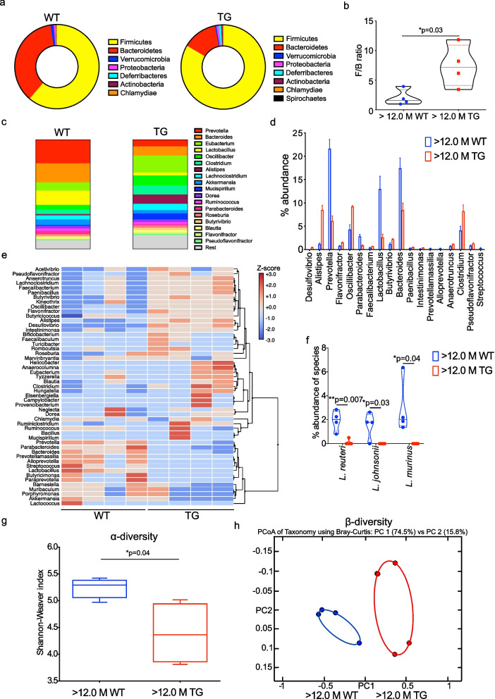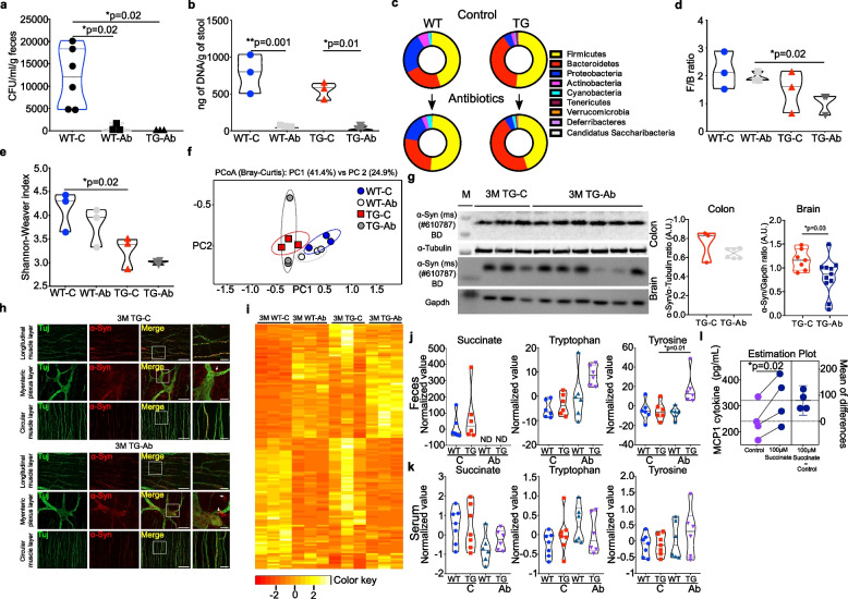 Results: We studied a transgenic (TG) rat model overexpressing the human SNCA gene and found that a progressive gut microbial composition alteration characterized by the reduction of Firmicutes to Bacteroidetes ratio could be detected in the young TG rats. Interestingly, this ratio then increased with ageing. The dynamics of Lactobacillus and Alistipes were monitored and reduced Lactobacillus and increased Alistipes abundance was discerned in ageing TG rats. Additionally, the SNCA gene overexpression resulted in gut α-Syn protein expression and increased with advanced age. Further, older TG animals had increased intestinal inflammation, decreased Na+ current and a robust alteration in metabolite production characterized by the increase of succinate levels in feces and serum. Manipulation of the gut bacteria by short-term antibiotic cocktail treatment revealed a complete loss of short-chain fatty acids and a reduction in succinate levels. Although antibiotic cocktail treatment did not change α-Syn expression in the enteric nervous system of the colon, however, reduced α-Syn expression was detected in the olfactory bulbs (forebrain) of the TG rats.