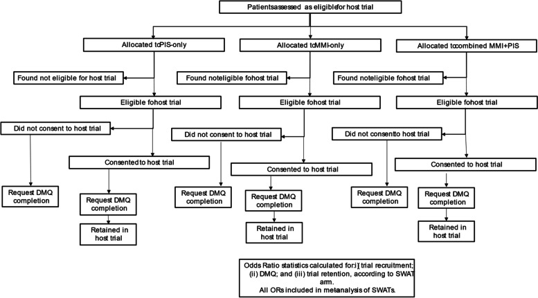 Results: Data from 3/6 SWATs for which it was possible were combined in a meta-analysis (n = 1758). Potential participants allocated to MMI-only were more likely to be recruited to the host trial than those allocated to PIS-only (OR 1.54; 95% CI 1.05, 2.28; p = 0.03). Those allocated to combined MMI + PIS compared to PIS-only were no more likely to be recruited to the host trial (OR = 0.89; 95% CI 0.53, 1.50; p = 0.67). Providing MMI rather than PIS did not impact on DMQ scores. Once children and young people had been recruited to host trials, their trial retention rates did not differ according to intervention allocation.