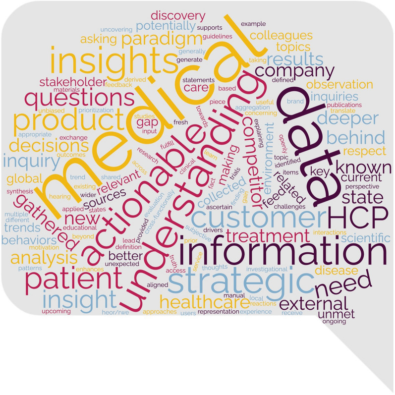 Background: Insights, when acted upon, can result in positive changes to the business, for HCPs, and ultimately for patients. Medical Information, as a customer facing function, is one of the groups that generate insights. Data and insights across different functions of an organization need to be compiled to provide a comprehensive view. The purpose of this paper is to develop a shared definition of insights and to provide a working guidance for the insight process.