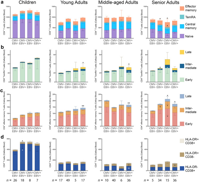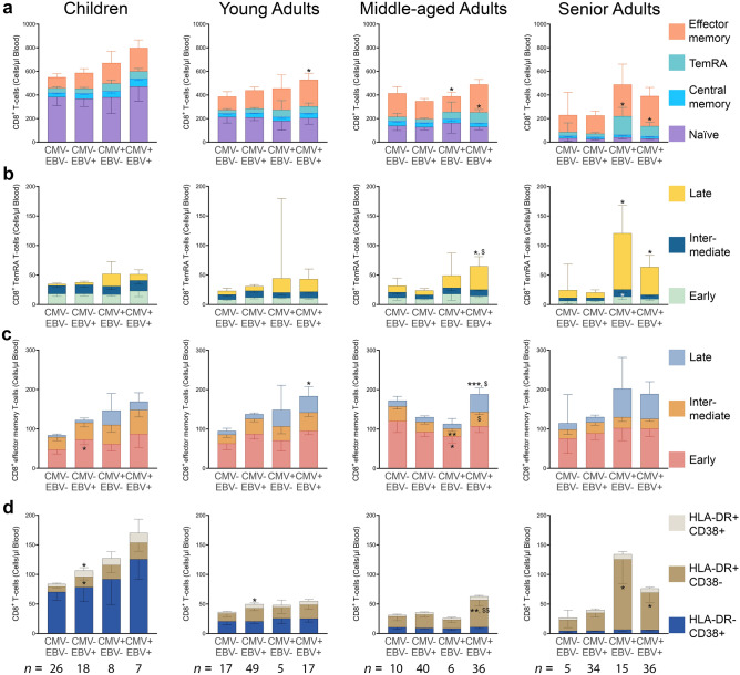 Cytomegalovirus (CMV) is known to alter circulating effector memory or re-expressing CD45RA+ (TemRA) T-cell numbers, but whether Epstein-Barr virus (EBV) does the same or this is amplified during a CMV and EBV co-infection is unclear. Immune cell numbers in blood of children and young, middle-aged, and senior adults (n = 336) were determined with flow cytometry, and additional multivariate linear regression, intra-group correlation, and cluster analyses were performed. Compared to non-infected controls, CMV-seropositive individuals from all age groups had more immune cell variance, and CMV+ EBV- senior adults had more late-differentiated CD4+ and CD8+ TemRA and CD4+ effector memory T-cells. EBV-seropositive children and young adults had a more equal immune cell composition than non-infected controls, and CMV- EBV+ senior adults had more intermediate/late-differentiated CD4+ TemRA and effector memory T-cells than non-infected controls. CMV and EBV co-infected young and middle-aged adults with an elevated BMI and anti-CMV antibody levels had a similar immune cell composition as senior adults, and CMV+ EBV+ middle-aged adults had more late-differentiated CD8+ TemRA, effector memory, and HLA-DR+ CD38- T-cells than CMV+ EBV- controls. This study identified changes in T-cell numbers in CMV- or EBV-seropositive individuals and that some CMV and EBV co-infected young and middle-aged adults had an aging-related T-cell phenotype.