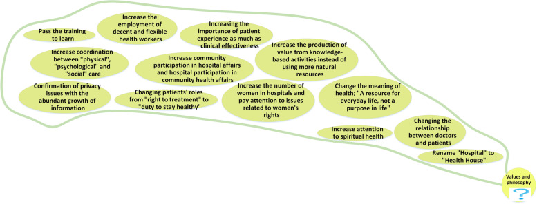 Methods: This study is a qualitative-exploratory one, conducted in two phases. In the first phase, in-depth and semi-structured interviews were conducted to identify future hospital changes over 15 years. The interviews were analyzed using the content analysis method and MAXQDA 2018 software and holding two expert panels to develop the mind map using the 2016 Visio software.