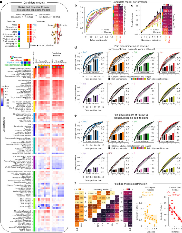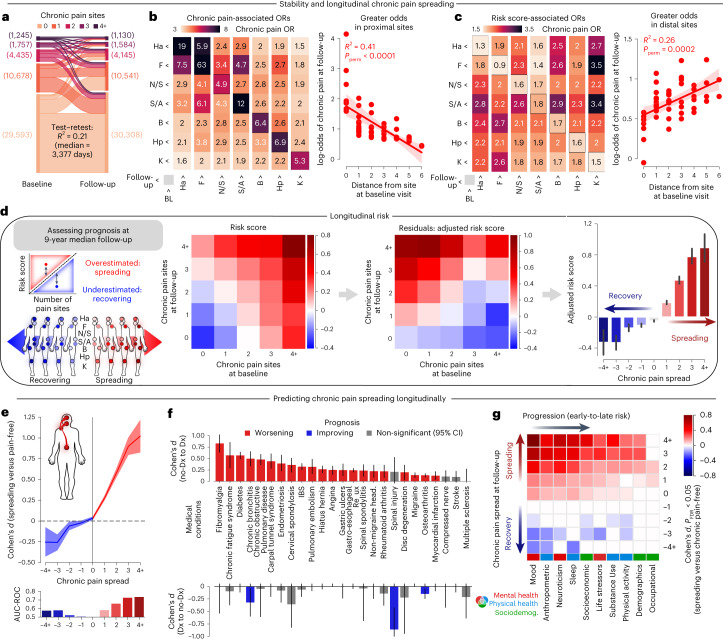 Chronic pain is a complex condition influenced by a combination of biological, psychological and social factors. Using data from the UK Biobank (n = 493,211), we showed that pain spreads from proximal to distal sites and developed a biopsychosocial model that predicted the number of coexisting pain sites. This data-driven model was used to identify a risk score that classified various chronic pain conditions (area under the curve (AUC) 0.70-0.88) and pain-related medical conditions (AUC 0.67-0.86). In longitudinal analyses, the risk score predicted the development of widespread chronic pain, the spreading of chronic pain across body sites and high-impact pain about 9 years later (AUC 0.68-0.78). Key risk factors included sleeplessness, feeling 'fed-up', tiredness, stressful life events and a body mass index >30. A simplified version of this score, named the risk of pain spreading, obtained similar predictive performance based on six simple questions with binarized answers. The risk of pain spreading was then validated in the Northern Finland Birth Cohort (n = 5,525) and the PREVENT-AD cohort (n = 178), obtaining comparable predictive performance. Our findings show that chronic pain conditions can be predicted from a common set of biopsychosocial factors, which can aid in tailoring research protocols, optimizing patient randomization in clinical trials and improving pain management.