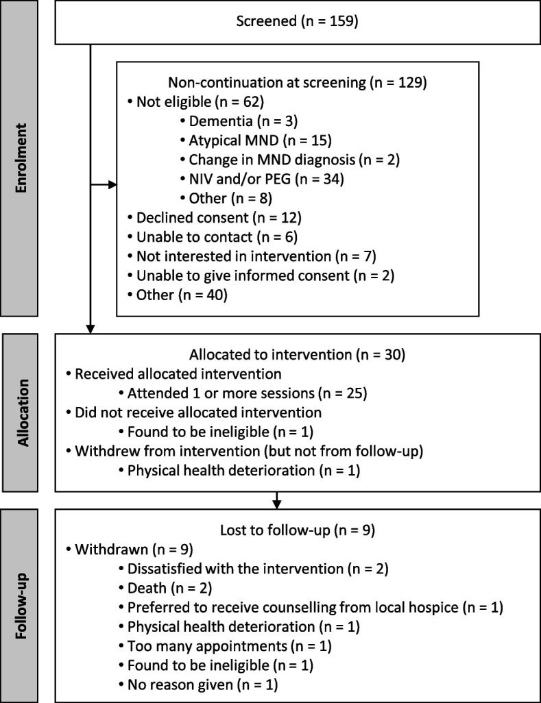 Results: Both a priori indicators of success were met: 29 plwMND (104%) were recruited and 76% (22/29) attended ≥ 2 sessions. Attrition at 6-months was higher than anticipated (8/29, 28%), but only two dropouts were due to lack of acceptability of the intervention. Acceptability was further supported by good satisfaction with therapy and session attendance. Data were possibly suggestive of small improvements in anxiety and psychological quality of life from baseline to 6 months in plwMND, despite a small but expected deterioration in disease-related functioning and health status.