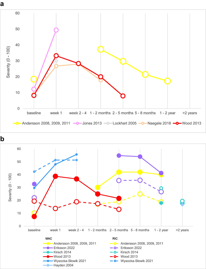 Results: Searches yielded 1792 unique records; 22 studies met the inclusion criteria. The quality scores ranged between 1 and 7, with a median score of 4. The prevalence, severity, and distress of xerostomia increased shortly after HSCT. Severity of xerostomia in allogeneic MAC recipients was higher compared to allogeneic RIC recipients 2-5 months post-HSCT (mean difference: 18 points on 0-100 scale, 95% CI: 9-27); after 1-2 years, there was no significant difference anymore.