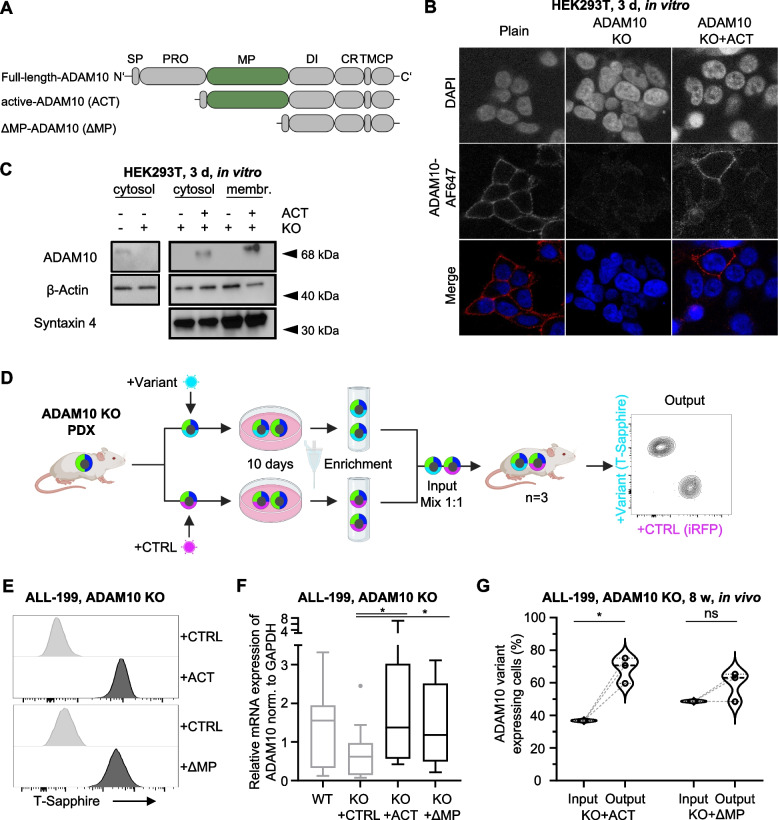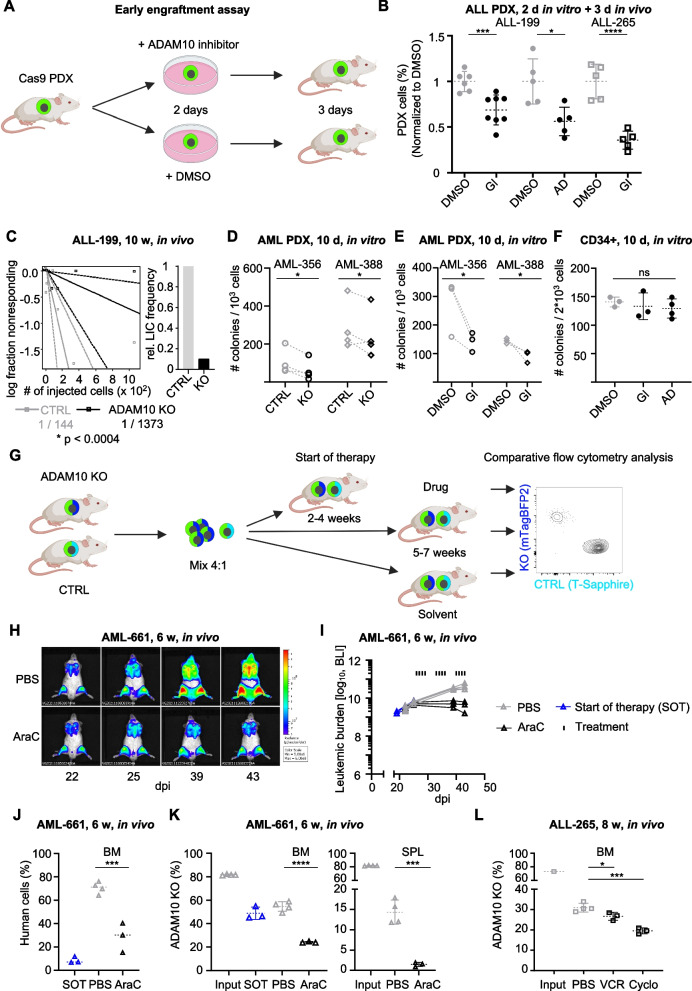 Results: A disintegrin and metalloproteinase domain-containing protein 10 (ADAM10) was identified as an essential vulnerability required for the survival and growth of different types of acute leukemias in vivo, and reconstitution assays in PDX models confirmed the relevance of its sheddase activity. Of translational importance, molecular or pharmacological targeting of ADAM10 reduced PDX leukemia burden, cell homing to the murine bone marrow and stem cell frequency, and increased leukemia response to conventional chemotherapy in vivo.