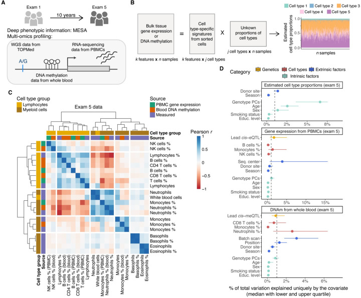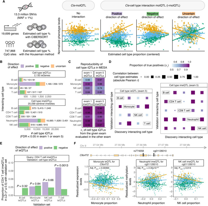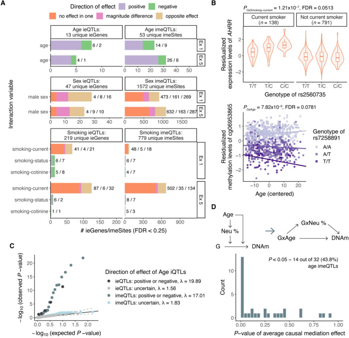 Bulk tissue molecular quantitative trait loci (QTLs) have been the starting point for interpreting disease-associated variants, while context-specific QTLs show particular relevance for disease. Here, we present the results of mapping interaction QTLs (iQTLs) for cell type, age, and other phenotypic variables in multi-omic, longitudinal data from blood of individuals of diverse ancestries. By modeling the interaction between genotype and estimated cell type proportions, we demonstrate that cell type iQTLs could be considered as proxies for cell type-specific QTL effects. The interpretation of age iQTLs, however, warrants caution as the moderation effect of age on the genotype and molecular phenotype association may be mediated by changes in cell type composition. Finally, we show that cell type iQTLs contribute to cell type-specific enrichment of diseases that, in combination with additional functional data, may guide future functional studies. Overall, this study highlights iQTLs to gain insights into the context-specificity of regulatory effects.