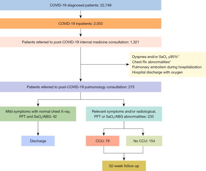 Methods: A prospective study of ≥18 years old patients hospitalized for SARS-COV-2 infection who develop persistent respiratory symptoms, lung function abnormalities or have radiological findings 6-8 weeks after hospital discharge. Logistic regression models were used to identify prognostic factors associated with a higher risk of developing respiratory problems. Models performance was assessed in terms of calibration and discrimination.