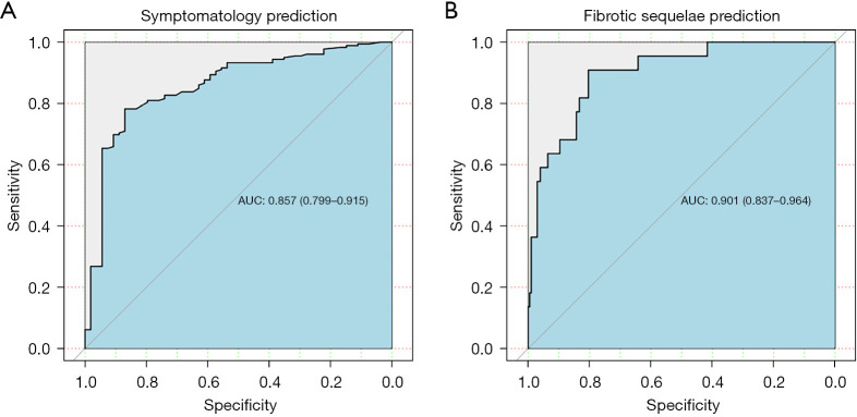 Results: A total of 233 patients [median age 66 years [interquartile range (IQR): 56, 74]; 138 (59.2%) male] were categorized into two groups based on whether they stayed in the critical care unit (79 cases) or not (154). At the end of follow-up, 179 patients (76.8%) developed persistent respiratory symptoms, and 22 patients (9.4%) showed radiological fibrotic lesions with pulmonary function abnormalities (post-COVID-19 fibrotic pulmonary lesions). Our prognostic models created to predict persistent respiratory symptoms [post-COVID-19 functional status at initial visit (the higher the score, the higher the risk), and history of bronchial asthma] and post-COVID-19 fibrotic pulmonary lesions [female; FVC% (the higher the FVC%, the lower the probability); and critical care unit stay] one year after infection showed good (AUC 0.857; 95% CI: 0.799-0.915) and excellent performance (AUC 0.901; 95% CI: 0.837-0.964), respectively.