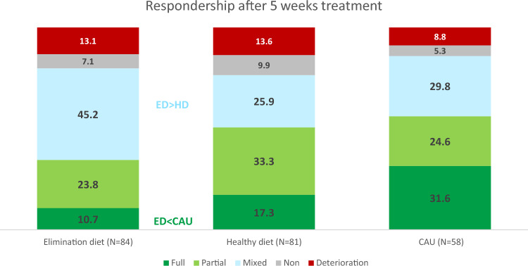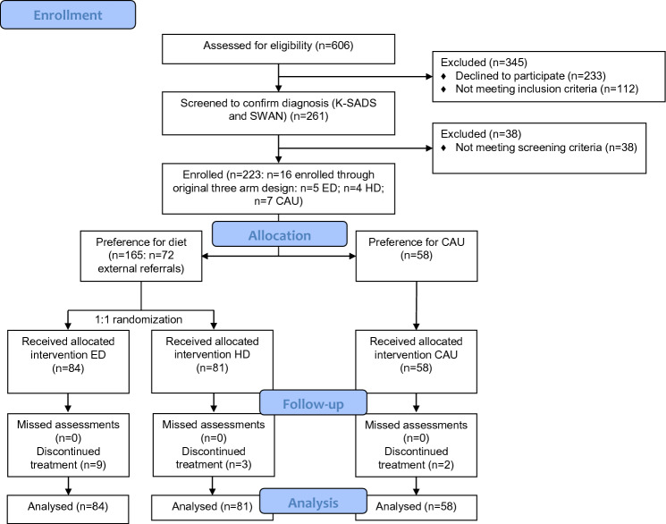 An Elimination Diet (ED) may be effective in reducing symptoms of Attention-Deficit/Hyperactivity Disorder (ADHD), but has never been compared to an active control condition [i.e., Healthy Diet (HD)]. In a two-armed RCT, a total of N = 165 children (5-12 years) with ADHD were randomized by means of minimization (1:1) to either an ED (N = 84) or HD (N = 81) within two Dutch child and adolescent psychiatry centers. The design included a non-randomized comparator arm including N = 58 children being treated with Care as Usual (CAU). Treatment allocation was unblinded. The primary outcome was a 5-point ordinal measure of respondership based on a combination of parent and teacher ratings on ADHD and emotion regulation, determined after 5 weeks of treatment. Ordinal regression analyses were done on an intention-to-treat basis. Fewer ED (35%) than HD (51%) participants showed a partial to full response, despite overall good-to-excellent treatment adherence (> 88%) and comparable high parental prior believes. A younger age and higher problem severity predicted a better respondership. CAU-preferring participants responded more often favorably (56%) compared to ED-but not HD-participants. Small-to-medium improvements in physical health (blood pressure, heart rate, and somatic complaints) were found in response to ED/HD versus decrements in response to CAU (74% received psychostimulants). The lack of superiority of the ED versus HD suggests that for the majority of children, dietary treatment response is not rooted in food-allergies/-sensitivities. The comparable results for treatment with HD and CAU are remarkable given that CAU participants were probably 'easier to treat' than HD (and ED) participants with proportionally fewer with a (suboptimal/non-response to) prior treatment with medication (4% versus 20%). Further assessment of long-term effects is needed to evaluate the potential place of dietary treatment within clinical guidelines. The trial is closed and registered in the Dutch trial registry, number NL5324 ( https://www.onderzoekmetmensen.nl/en/trial/25997 ).