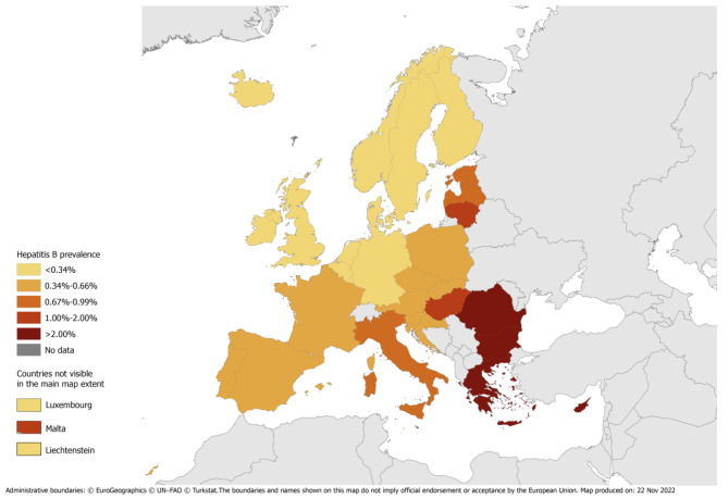 Methods: We combined data from a 2018 systematic review (updated in 2021), data gathered directly by the European Centre for Disease Control (ECDC) from EU/EEA countries and the UK and further country-level data. We included data on adults from the general population, pregnant women, first time blood donors (FTBD), men who have sex with men (MSM), prisoners, people who inject drugs (PWID), and migrants from 2001 to 2021, with three exceptions made for pre-2001 estimates. Finite Mixture Models (FMM) and Beta regression were used to predict country and population group HBsAg prevalence. A separate multiplier method was used to estimate HBsAg prevalence among the migrant populations within each country, due to biases in the data available.