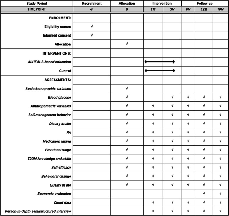 Methods: This is a nested mixed-method study that includes a community-based cluster-randomized control trial and personal in-depth interviews. Individuals with T2DM between the ages of 18 and 75 will be recruited from 40-45 community health centers in Beijing, China. Participants will either receive standard diabetes primary care (SDPC) (control, 3 months) or SDPC plus AI-HEALS online health education program (intervention, 3 months). The AI-HEALS runs in the WeChat service platform, which includes a KBQA, a system of physiological indicators and lifestyle recording and monitoring, medication and blood glucose monitoring reminders, and automated, personalized message sending. Data on sociodemography, medical examination, blood glucose, and self-management behavior will be collected at baseline, as well as 1,3,6,12, and 18 months later. The primary outcome is to reduce HbA1c levels. Secondary outcomes include changes in self-management behavior, social cognition, psychology, T2DM skills, and health literacy. Furthermore, the cost-effectiveness of the AI-HEALS-based intervention will be evaluated.