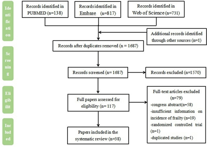 Results: A total of 38 articles were included for the quantitative analysis after the collected literature was either included or omitted based on pertinent criteria. The results indicated that the estimated overall pooled prevalence of frailty was 36% (95% confidence interval [CI] = 31-41%), and the estimated pre-frailty was 43% (95% CI = 37-49%). A higher age (odds ratio [OR] = 1.04; 95% CI = 1.01-1.06) and higher COPD assessment test (CAT) score (OR = 1.19; 95% CI = 1.12-1.27) were associated with a significantly increased likelihood of frailty in patients with COPD. However, a higher educational attainment (OR = 0.55; 95% CI = 0.43-0.69) and higher income (OR = 0.63; 95% CI = 0.45-0.88) were associated with a significantly reduced risk of frailty in patients with COPD. A total of 17 other risk factors for frailty were identified via qualitative synthesis.