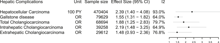 Results: 25 meta-analyses were included in the present review. NAFLD increased the risks of systemic complications, including cardiovascular diseases, systemic malignancies, diabetes, and chronic kidney disease. Regarding hepatic outcomes, the incidence of hepatocellular carcinoma in NAFLD was 2.39 per 100 person years (CI: 1.40 to 4.08). Individuals with NAFLD were also found to have an increased likelihood of cholangiocarcinoma (OR: 1.88, CI: 1.25 to 2.83) and gallstone disease (OR: 1.55, CI: 1.31 to 1.82) compared to individuals without NAFLD. NAFLD was associated with a higher risk of fatal and non-fatal CVD events (HR: 1.45, CI: 1.31 to 1.61) compared to individuals without NAFLD. Coronary heart disease and subclinical and clinical coronary heart disease were also significantly elevated in NAFLD individuals compared to individuals without NAFLD. Additionally, NAFLD was associated with an increased risk of all-cause mortality (HR: 1.34, CI: 1.17 to 1.54) and cardiovascular (HR: 1.30, CI: 1.08 to 1.56) but not cancer-related mortality.