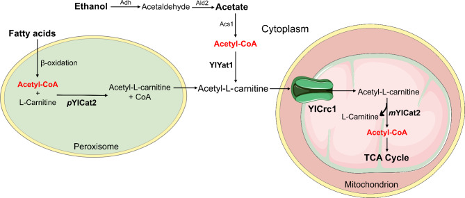 Conclusions: The Carnitine/Acetyl-Carnitine shuttle of Y. lipolytica involving YlCrc1, is the sole pathway for transporting peroxisomal or cytosolic acetyl-CoA to mitochondria. Manipulation of this carrier can be a promising target for metabolic engineering approaches involving cytosolic acetyl-CoA, as demonstrated by the effect of YlCRC1 deletion on OCFAs synthesis.