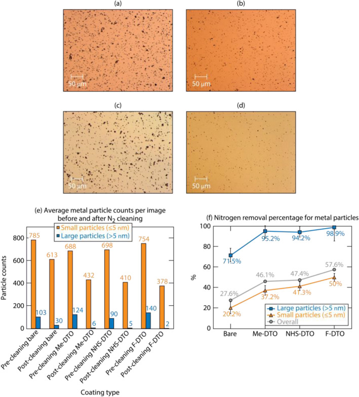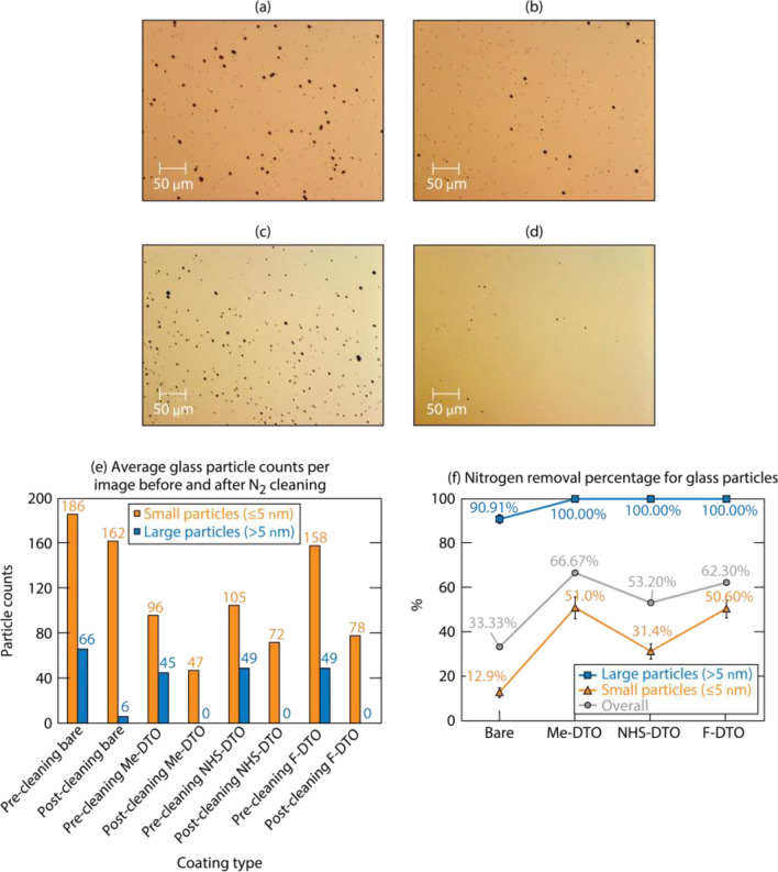 Three organic monolayers coatings were developed and tested for their effectiveness to increase cleaning efficiency of attached microscale particles by air flows. The experiments were performed using silica substrates coated with these organic thin films and subsequently exposed to stainless-steel and silica microparticles as a model of contamination. Laser-induced-damage tests confirmed that the coatings do not affect the laser-induced-damage threshold values. The particle exposure results suggest that although the accumulation of particles is not significantly affected under the experimental conditions used in this work, the coated substrates exhibit significantly improved cleaning efficiency with a gas flow. A size-distribution analysis was conducted to study the adsorption and cleaning efficiency of particles of different sizes. It was observed that larger size (> 5-μm) particles can be removed from coated substrates with almost 100% efficiency. It was also determined that the coatings improve the cleaning efficiency of the smaller particles (≤ 5 μm) by 17% to 30% for the stainless steel metal and 19% to 38% for the silica particles.