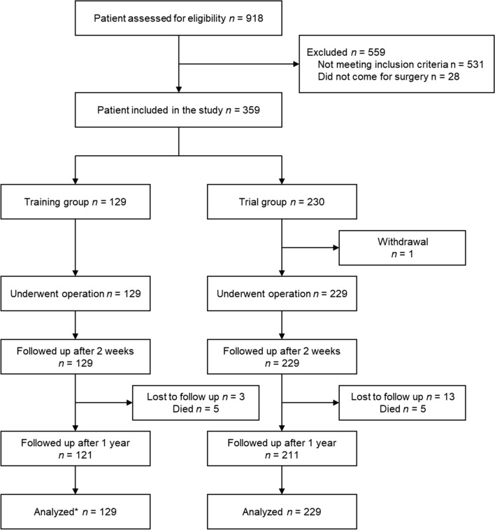 Methods: All trainees received a one-day theoretical module on mesh hernia repair under local anaesthesia followed by hands-on training. Performance was assessed using the American College of Surgeon's Groin Hernia Operative Performance Rating System. Patients were followed up two weeks and one year after surgery. Outcomes of the patients operated on during the training trial were compared to the 229 trial patients operated on after the training.