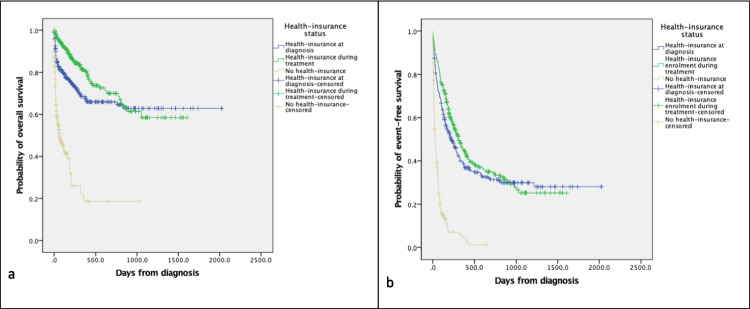 Findings: From 2010-2016, 879 children were newly diagnosed with cancer. Among 763 patients whose records were available, 28% abandoned treatment, 23% died and 17% had progressive/relapsed disease resulting in 32% event-free survival. In total 280 patients (37%) had health-insurance at diagnosis. After active enrolment during treatment, total health-insurance registration level reached 579 patients (76%). Treatment outcomes differed by health-insurance status (P < 0.001). The most likely treatment outcome in uninsured patients was death (49%), whereas in those with health-insurance at diagnosis and those who enrolled during treatment it was event-free survival (36% and 41% respectively). Overall survival (P < 0.001) and event-free survival (P < 0.001) were higher for insured versus uninsured patients. The hazard-ratio for treatment failure was 0.30 (95% CI:0.22-0.39; P < 0.001) for patients insured at diagnosis and 0.32 (95% CI:0.24-0.41; P < 0.001) for patients insured during treatment in relation to those without insurance.