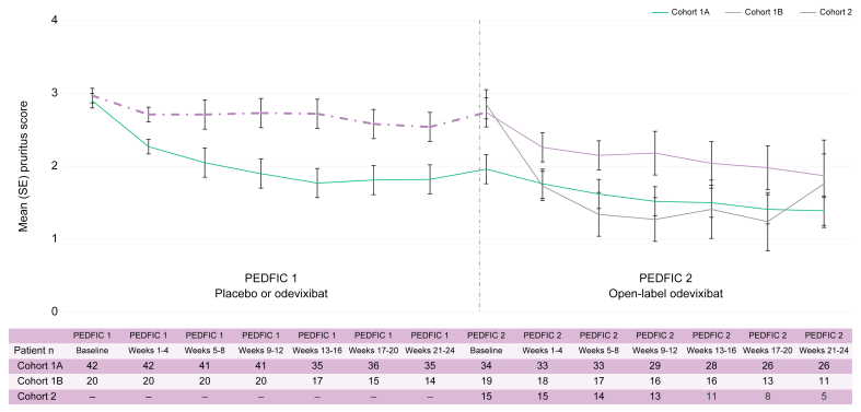 Methods: PEDFIC 2 enrolled and dosed 69 patients across two cohorts; all received odevixibat 120 μg/kg per day. Cohort 1 comprised children from PEDFIC 1, and cohort 2 comprised new patients (any age). We report data through 15 July 2020, with Week 24 of PEDFIC 2 the main time point analysed. This represents up to 48 weeks of cumulative exposure for patients treated with odevixibat from the 24-week PEDFIC 1 study (cohort 1A) and up to 24 weeks of treatment for those who initiated odevixibat in PEDFIC 2 (patients who received placebo in PEDFIC 1 [cohort 1B] or cohort 2 patients). Primary endpoints for this prespecified interim analysis were change from baseline to Weeks 22-24 in serum bile acids (sBAs) and proportion of positive pruritus assessments (≥1-point drop from PEDFIC 2 baseline in pruritus on a 0-4 scale or score ≤1) over the 24-week period. Safety monitoring included evaluating treatment-emergent adverse events (TEAEs).