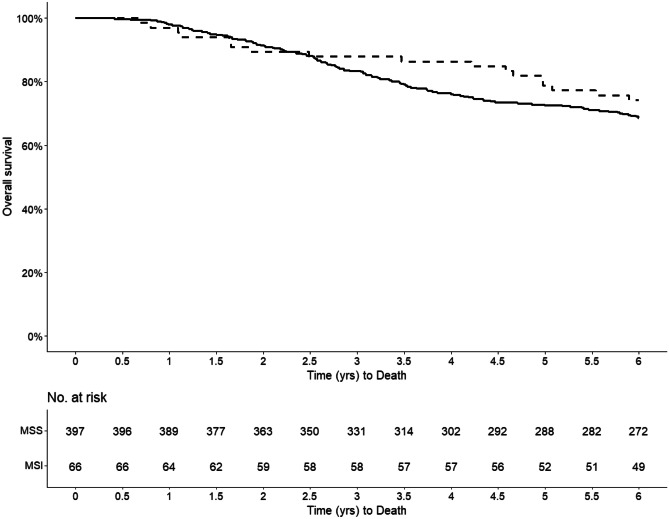 Results: In total, 463 patients were included, MSI high tumors were present in 66 patients (14%), and the remaining 397 were MSS/MSI low. Within 6 years, distant recurrences were present in 9.1% and 20.2% (P = 0.049), and death occurred in 25.8% and 31.5% in MSI and MSS patients, respectively. There was no statistically significant difference in overall mortality (HR 0.80, 95% CI 0.46-1.38), relapse-free survival (HR 0.82, 95% CI 0.50-1.36), or cancer-specific mortality (HR 1.60, 95% CI 0.73-3.51).