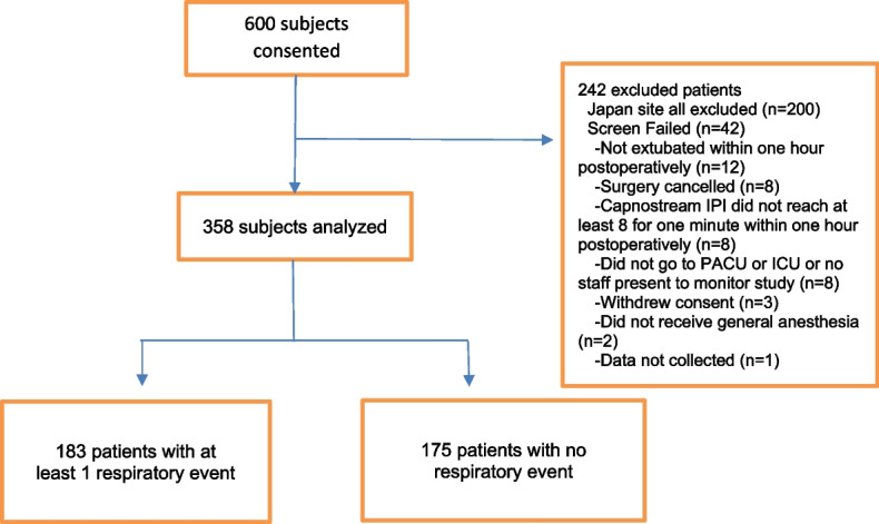 Methods: In this investigator-initiated study, adult patients undergoing general anesthesia were monitored with the Capnostream-20p monitor for up to 2 h during their recovery room stay. The study coordinator, who along with clinicians, was blinded to IPI values, recorded the time of any respiratory event, defined a priori as any one of eight respiratory-related interventions/conditions. The primary sensitivity endpoint (early detection success) was defined as at least 80% of events predicted by at least 2 consecutive low IPI (≤ 7) values within 2-15 min before an event occurred. Late detection was defined as low IPI values occurring with 2 min prior to or 2 min after the event occurred.