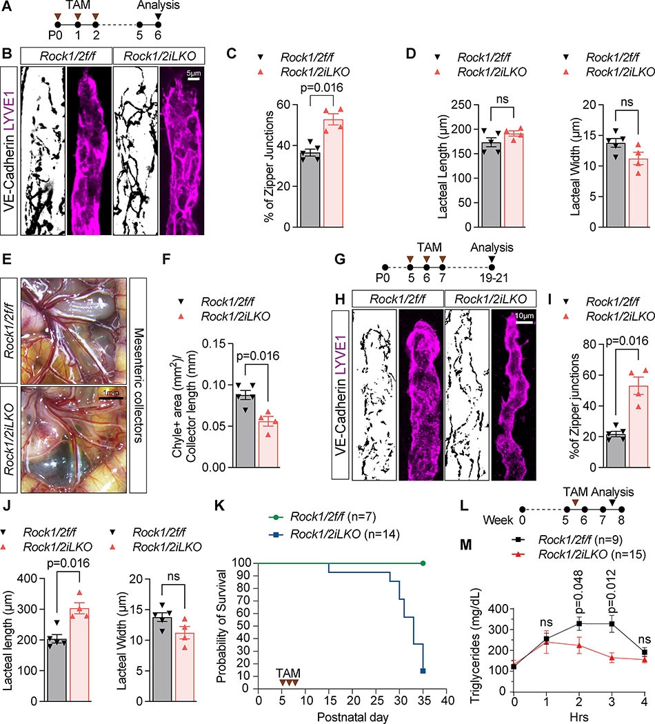 Results: By studying the permeability of intestinal lacteal capillaries to lipoprotein particles known as chylomicrons, we show that ROCK (Rho-associated kinase)-dependent cytoskeletal contractility is a fundamental mechanism of LEC permeability regulation. We show that chylomicron-derived lipids trigger neonatal lacteal junction opening via ROCK-dependent contraction of junction-anchored stress fibers. LEC-specific ROCK deletion abolished junction opening and plasma lipid uptake. Chylomicrons additionally inhibited VEGF (vascular endothelial growth factor)-A signaling. We show that VEGF-A antagonizes LEC junction opening via VEGFR (VEGF receptor) 2 and VEGFR3-dependent PI3K (phosphatidylinositol 3-kinase)/AKT (protein kinase B) activation of the small GTPase RAC1 (Rac family small GTPase 1), thereby restricting RhoA (Ras homolog family member A)/ROCK-mediated cytoskeleton contraction.