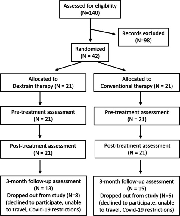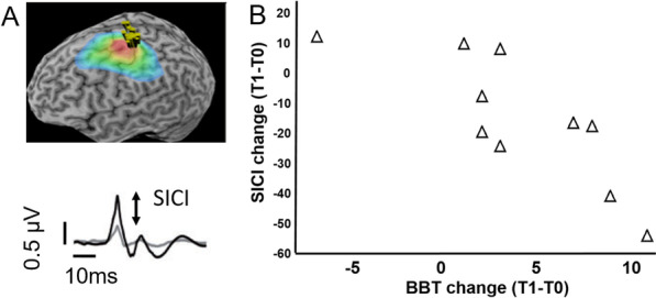 Results: BBT-change after training did not differ between the Dextrain (N = 21) vs CT group (N = 21) (median [IQR] = 5[2-7] vs 4[2-7], respectively; P = 0.36). Gains in BBT were maintained at the 3-month post-training follow-up, with a non-significant trend for enhanced BBT-change in the Dextrain group (median [IQR] = 3[- 1-7.0], P = 0.06). Several secondary outcomes showed significantly larger changes in the Dextrain group: finger tracking precision (mean ± SD = 0.3 ± 0.3N vs - 0.1 ± 0.33N; P < 0.0018), independent finger movements (34.7 ± 25.1 ms vs 7.7 ± 18.5 ms, P = 0.02) and maximal finger tapping speed (8.4 ± 7.1 vs 4.5 ± 4.9, P = 0.045). At follow-up, Dextrain group showed significantly greater improvement in Motor Activity Log (median/IQR = 0.7/0.2-0.8 vs 0.2/0.1-0.6, P = 0.05). Across both groups SICI increased in patients with greater BBT-change (Rho = 0.80, P = 0.006). Comparing Dextrain subgroups with maximal grip force higher/lower than median (61.2%), BBT-change was significantly larger in patients with low vs high grip force (7.5 ± 5.6 vs 2.9 ± 2.8; respectively, P = 0.015).