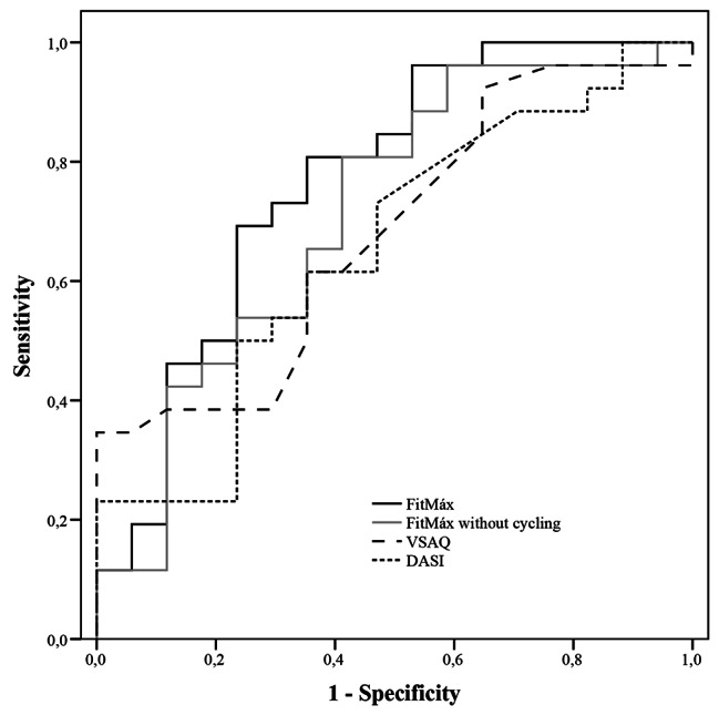 Background: Evaluating the criterion validity and responsiveness of the self-reported FitMáx©-questionnaire, Duke Activity Status Index (DASI) and Veterans Specific Activity Questionnaire (VSAQ) to monitor aerobic capacity in cancer survivors.