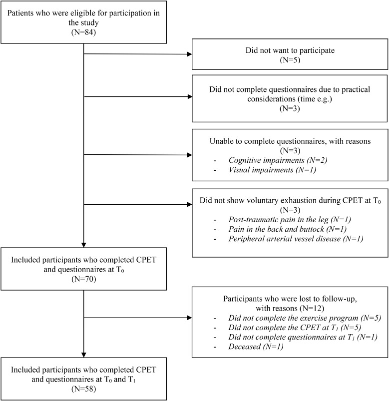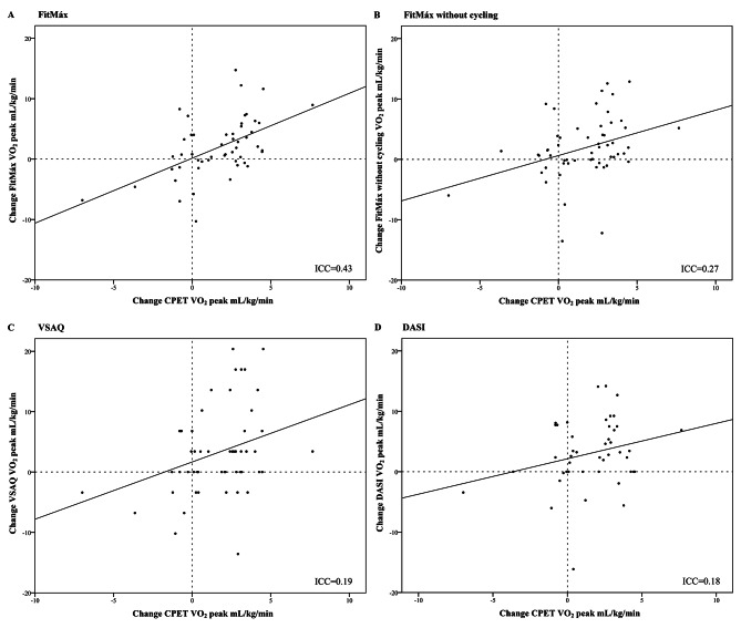 Results: Seventy participants were included. Outcomes at T1 were available for 58 participants (83%). Mean CPET-VO2peak significantly improved at T1 (Δ1.6 mL·kg- 1·min- 1 or 8%). Agreement between questionnaire-VO2peak and CPET-VO2peak at T0 was moderate for the FitMáx©-questionnaire (ICC = 0.69) and VSAQ (ICC = 0.53), and poor for DASI (ICC = 0.36). Poor agreement was found between ΔCPET-VO2peak and Δquestionnaire-VO2peak for all questionnaires (ICC 0.43, 0.19 and 0.18 for the FitMáx©-questionnaire, VSAQ and DASI, respectively). ROC analysis showed that the FitMáx©-questionnaire was able to detect improvements in CPET-VO2peak (area under the curve, AUC = 0.77), when using a cut-off value of 1.0 mL·kg- 1·min- 1, while VSAQ (AUC = 0.66) and DASI (AUC = 0.64) could not.