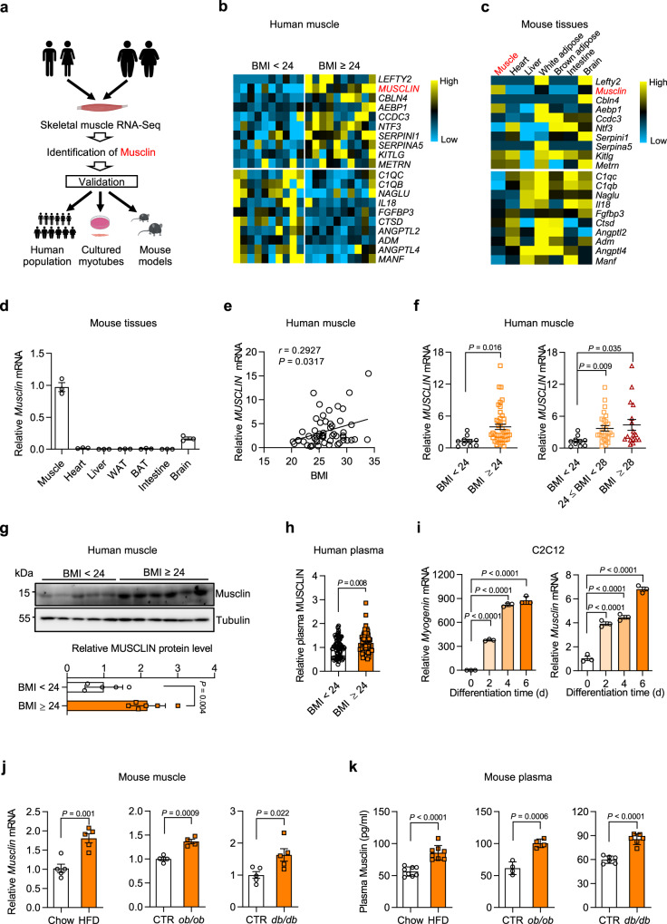 Skeletal muscle and thermogenic adipose tissue are both critical for the maintenance of body temperature in mammals. However, whether these two tissues are interconnected to modulate thermogenesis and metabolic homeostasis in response to thermal stress remains inconclusive. Here, we report that human and mouse obesity is associated with elevated Musclin levels in both muscle and circulation. Intriguingly, muscle expression of Musclin is markedly increased or decreased when the male mice are housed in thermoneutral or chronic cool conditions, respectively. Beige fat is then identified as the primary site of Musclin action. Muscle-transgenic or AAV-mediated overexpression of Musclin attenuates beige fat thermogenesis, thereby exacerbating diet-induced obesity and metabolic disorders in male mice. Conversely, Musclin inactivation by muscle-specific ablation or neutralizing antibody treatment promotes beige fat thermogenesis and improves metabolic homeostasis in male mice. Mechanistically, Musclin binds to transferrin receptor 1 (Tfr1) and antagonizes Tfr1-mediated cAMP/PKA-dependent thermogenic induction in beige adipocytes. This work defines the temperature-sensitive myokine Musclin as a negative regulator of adipose thermogenesis that exacerbates the deterioration of metabolic health in obese male mice and thus provides a framework for the therapeutic targeting of this endocrine pathway.