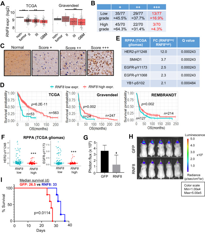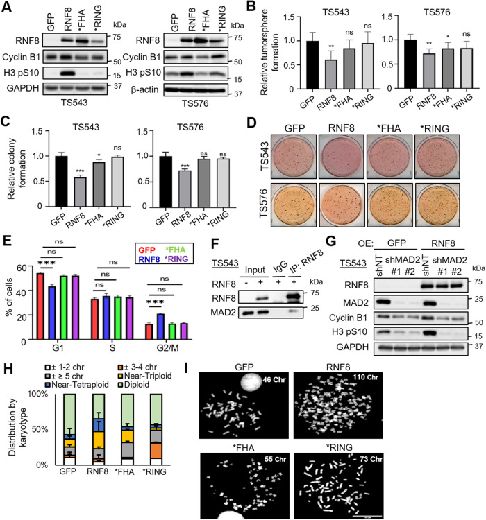 MAD2 is a spindle assembly checkpoint protein that participates in the formation of mitotic checkpoint complex, which blocks mitotic progression. RNF8, an established DNA damage response protein, has been implicated in mitotic checkpoint regulation but its exact role remains poorly understood. Here, RNF8 proximity proteomics uncovered a role of RNF8-MAD2 in generating the mitotic checkpoint signal. Specifically, RNF8 competes with a small pool of p31comet for binding to the closed conformer of MAD2 via its RING domain, while CAMK2D serves as a molecular scaffold to concentrate the RNF8-MAD2 complex via transient/weak interactions between its p-Thr287 and RNF8's FHA domain. Accordingly, RNF8 overexpression impairs glioma stem cell (GSC) mitotic progression in a FHA- and RING-dependent manner. Importantly, low RNF8 expression correlates with inferior glioma outcome and RNF8 overexpression impedes GSC tumorigenicity. Last, we identify PLK1 inhibitor that mimics RNF8 overexpression using a chemical biology approach, and demonstrate a PLK1/HSP90 inhibitor combination that synergistically reduces GSC proliferation and stemness. Thus, our study has unveiled a previously unrecognized CAMK2D-RNF8-MAD2 complex in regulating mitotic checkpoint with relevance to gliomas, which is therapeutically targetable.