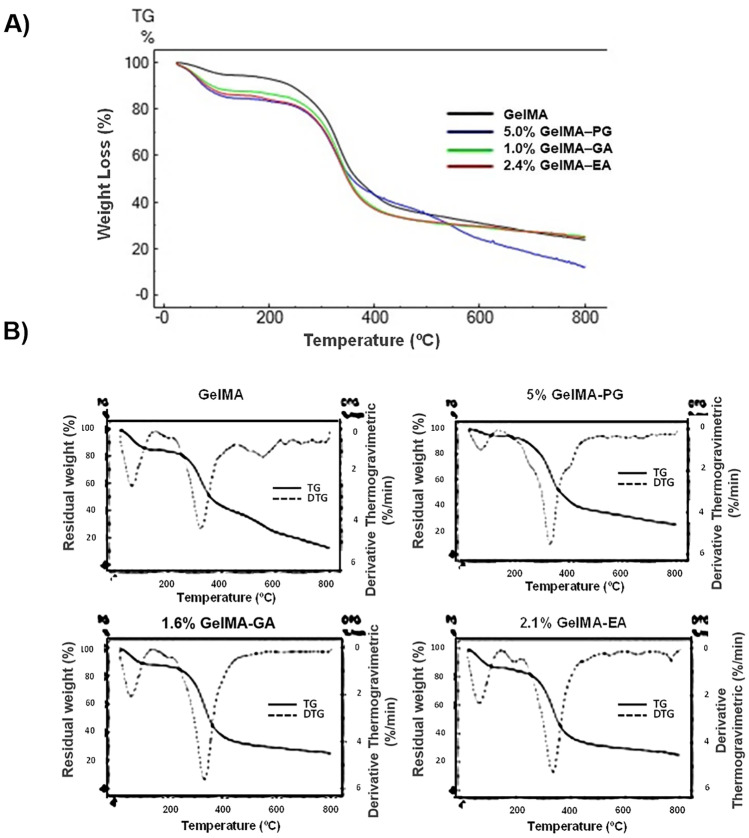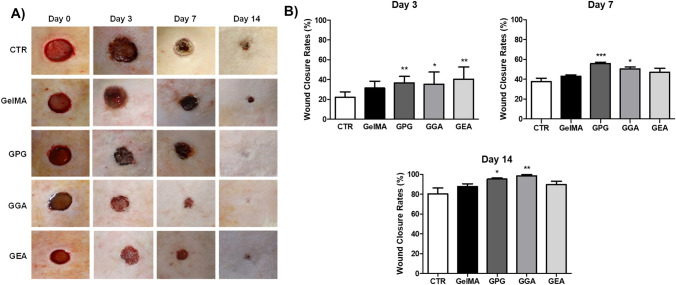 Gelatin-based photopolymerizable methacrylate hydrogel (GelMA) is a promising biomaterial for in situ drug delivery, while aqueous extract of Punica granatum (AEPG) peel fruit rich in gallic acid and ellagic acid is used to improve wound healing. The aim of this study was to develop and analyze the healing properties of GelMA containing AEPG, gallic acid, or ellagic acid in a rodent model. GelMA hydrogels containing 5% AEPG (GelMA-PG), 1.6% gallic acid (GelMA-GA), or 2.1% ellagic acid (GelMA-EA) were produced and their mechanical properties, enzymatic degradation, and thermogravimetric profile determined. Wound closure rates, healing histological grading, and immunohistochemical counts of myofibroblasts were assessed over time. The swelling of hydrogels varied between 50 and 90%, and GelMA exhibited a higher swelling than the other groups. The GPG samples showed higher compression and Young's moduli than GelMA, GGA, and GAE. All samples degraded around 95% in 48 h. GPG and GGA significantly accelerated wound closure, improved collagenization, increased histological grading, and hastened myofibroblast differentiation in comparison to the control, GelMA, and GEA. GelMA containing AEPG (GPG) improved wound healing, and although gallic acid is the major responsible for such biological activity, a potential synergic effect played by other polyphenols present in the extract is evident.