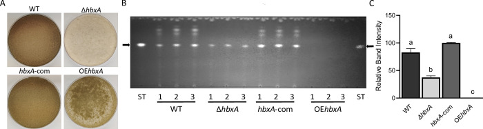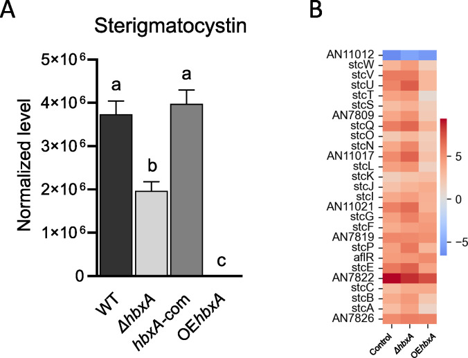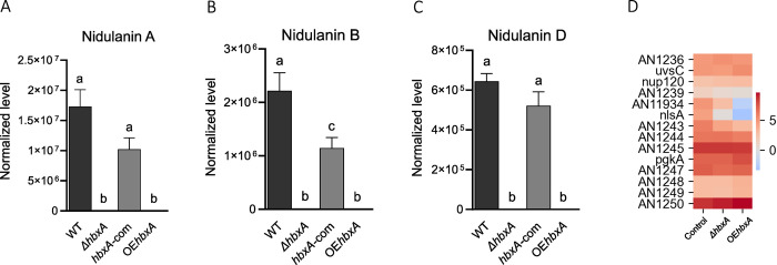 In fungi, conserved homeobox-domain proteins are transcriptional regulators governing development. In Aspergillus species, several homeobox-domain transcription factor genes have been identified, among them, hbxA/hbx1. For instance, in the opportunistic human pathogen Aspergillus fumigatus, hbxA is involved in conidial production and germination, as well as virulence and secondary metabolism, including production of fumigaclavines, fumiquinazolines, and chaetominine. In the agriculturally important fungus Aspergillus flavus, disruption of hbx1 results in fluffy aconidial colonies unable to produce sclerotia. hbx1 also regulates production of aflatoxins, cyclopiazonic acid and aflatrem. Furthermore, transcriptome studies revealed that hbx1 has a broad effect on the A. flavus genome, including numerous genes involved in secondary metabolism. These studies underline the importance of the HbxA/Hbx1 regulator, not only in developmental processes but also in the biosynthesis of a broad number of fungal natural products, including potential medical drugs and mycotoxins. To gain further insight into the regulatory scope of HbxA in Aspergilli, we studied its role in the model fungus Aspergillus nidulans. Our present study of the A. nidulans hbxA-dependent transcriptome revealed that more than one thousand genes are differentially expressed when this regulator was not transcribed at wild-type levels, among them numerous transcription factors, including those involved in development as well as in secondary metabolism regulation. Furthermore, our metabolomics analyses revealed that production of several secondary metabolites, some of them associated with A. nidulans hbxA-dependent gene clusters, was also altered in deletion and overexpression hbxA strains compared to the wild type, including synthesis of nidulanins A, B and D, versicolorin A, sterigmatocystin, austinol, dehydroaustinol, and three unknown novel compounds.