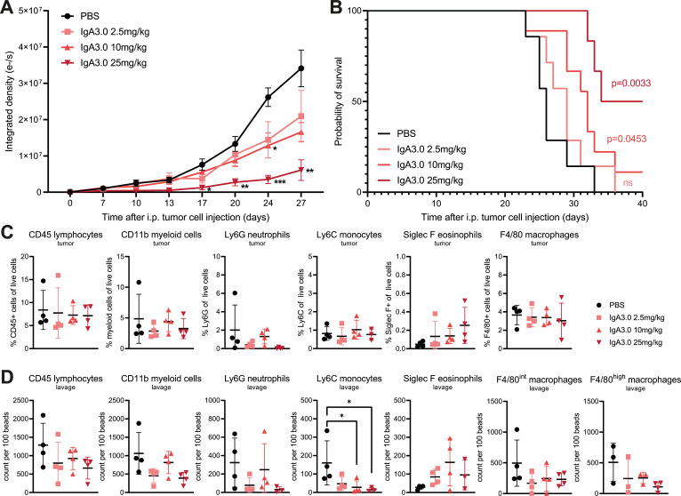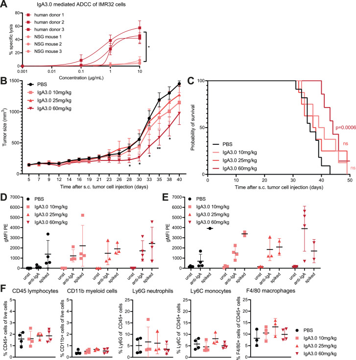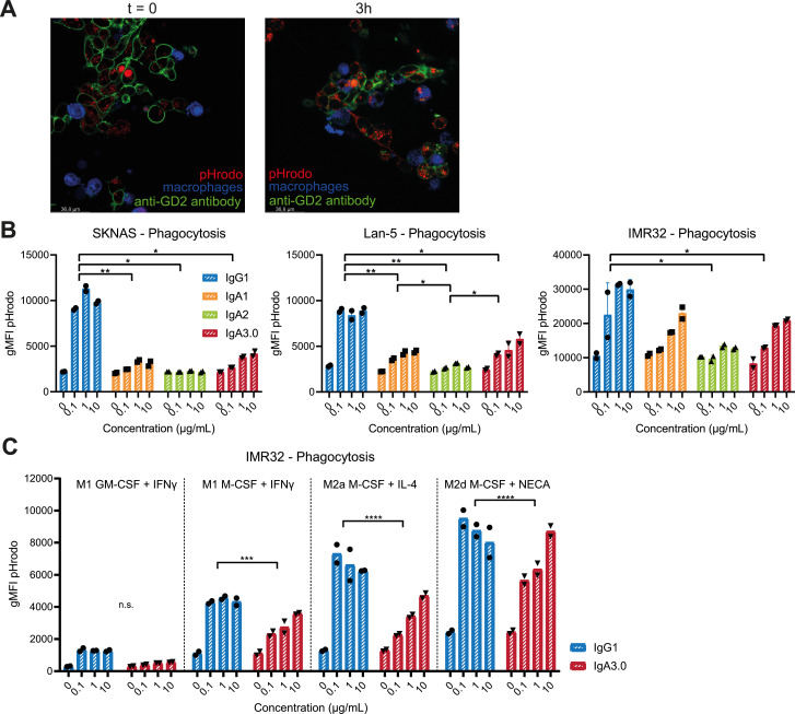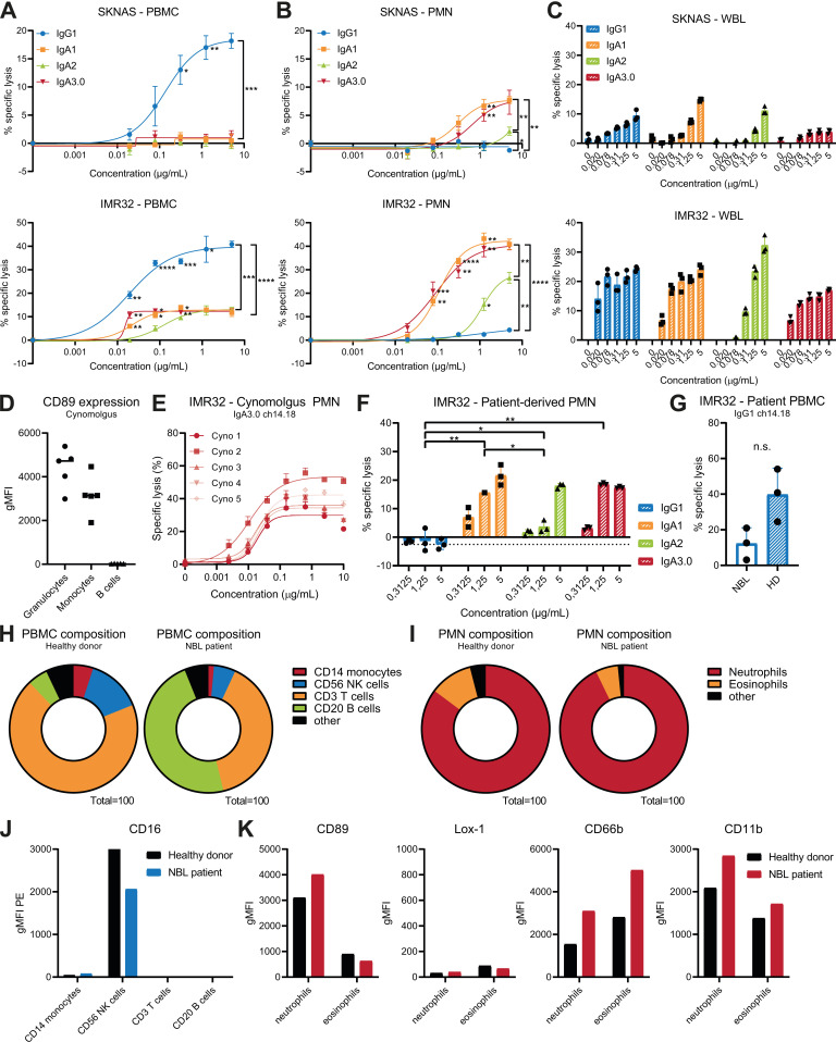 Methods: To generate an antibody suitable for clinical application, we engineered an IgA molecule (named IgA3.0 ch14.18) with increased stability, mutated glycosylation sites and substituted free (reactive) cysteines. The following mutations were introduced: N45.2G and P124R (CH1 domain), C92S, N120T, I121L and T122S (CH2 domain) and a deletion of the tail piece P131-Y148 (CH3 domain). IgA3.0 ch14.18 was evaluated in binding assays and in ADCC and antibody-dependent cellular phagocytosis (ADCP) assays with human, neuroblastoma patient and non-human primate effector cells. We performed mass spectrometry analysis of N-glycans and evaluated the impact of altered glycosylation in IgA3.0 ch14.18 on antibody half-life by performing pharmacokinetic (PK) studies in mice injected intravenously with 5 mg/kg antibody solution. A dose escalation study was performed to determine in vivo efficacy of IgA3.0 ch14.18 in an intraperitoneal mouse model using 9464D-GD2 neuroblastoma cells as well as in a subcutaneous human xenograft model using IMR32 neuroblastoma cells. Binding assays and PK studies were compared with one-way analysis of variance (ANOVA), ADCC and ADCP assays and in vivo tumor outgrowth with two-way ANOVA followed by Tukey's post-hoc test.