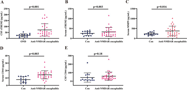 Conclusion: Increased sTREM2 levels in CSF as well as increased CD44 and MMP9 in serum and CSF reflected activation of microglia and disruption of the BBB in anti-NMDAR encephalitis, expanding the understanding of neuroinflammation in this disease. The factors mentioned above may have potential as novel targets for intervention or novel diagnostic biomarkers.