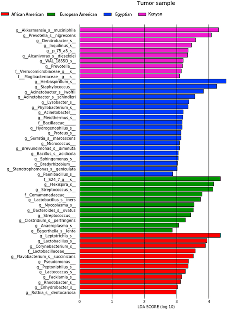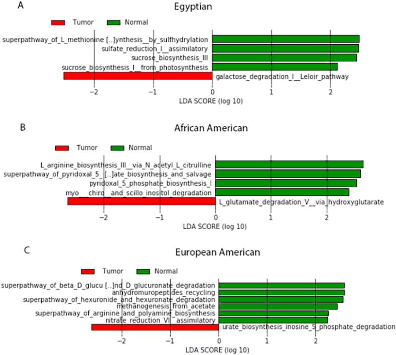 Results: Differential microbiome analysis of CRCs across all racial/ethnic groups showed dysbiosis. There were high abundances of Herbaspirillum and Staphylococcus in CRCs of Egyptians, Leptotrichia in CRCs of AAs, Flexspiria and Streptococcus in CRCs of EAs, and Akkermansia muciniphila and Prevotella nigrescens in CRCs of Kenyans (LDA score >4, adj. p-value <0.05). Functional analyses showed distinct microbial metabolic pathways in CRCs compared to normal tissues within the racial/ethnic groups. Egyptian CRCs, compared to normal tissues, showed lower l-methionine biosynthesis and higher galactose degradation pathways.