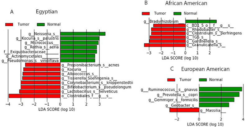 Patients and methods: CRCs and their corresponding normal tissues from Egyptian (n = 17) patients of the Alexandria University Hospital, Egypt, and tissues from AA (n = 18) and EA (n = 19) patients at the University of Alabama at Birmingham were collected. DNA was isolated from frozen tissues, and the microbiome composition was analyzed by 16S rRNA sequencing. Differential microbial abundance, diversity, and metabolic pathways were identified using linear discriminant analysis (LDA) effect size analyses. Additionally, we compared these profiles with our previously published microbiome data derived from Kenyan CRC patients.