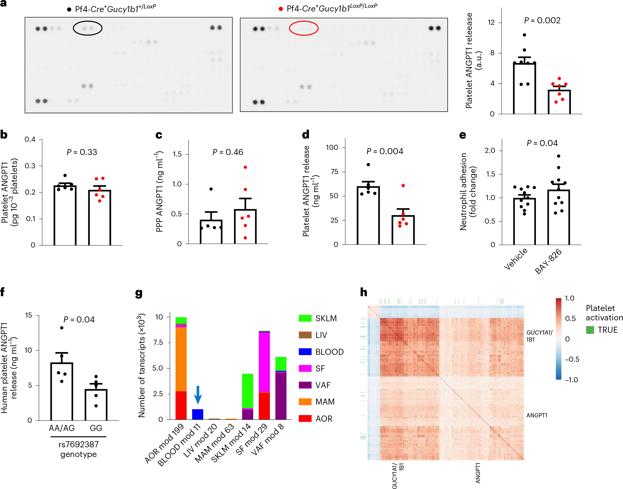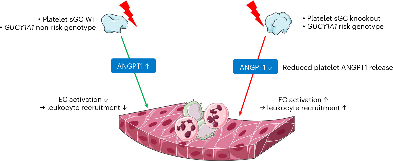 Variants in genes encoding the soluble guanylyl cyclase (sGC) in platelets are associated with coronary artery disease (CAD) risk. Here, by using histology, flow cytometry and intravital microscopy, we show that functional loss of sGC in platelets of atherosclerosis-prone Ldlr-/- mice contributes to atherosclerotic plaque formation, particularly via increasing in vivo leukocyte adhesion to atherosclerotic lesions. In vitro experiments revealed that supernatant from activated platelets lacking sGC promotes leukocyte adhesion to endothelial cells (ECs) by activating ECs. Profiling of platelet-released cytokines indicated that reduced platelet angiopoietin-1 release by sGC-depleted platelets, which was validated in isolated human platelets from carriers of GUCY1A1 risk alleles, enhances leukocyte adhesion to ECs. I mp or ta ntly, p ha rm ac ol ogical sGC stimulation increased platelet angiopoietin-1 release in vitro and reduced leukocyte recruitment and atherosclerotic plaque formation in atherosclerosis-prone Ldlr-/- mice. Therefore, pharmacological sGC stimulation might represent a potential therapeutic strategy to prevent and treat CAD.