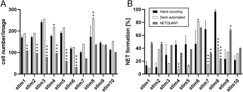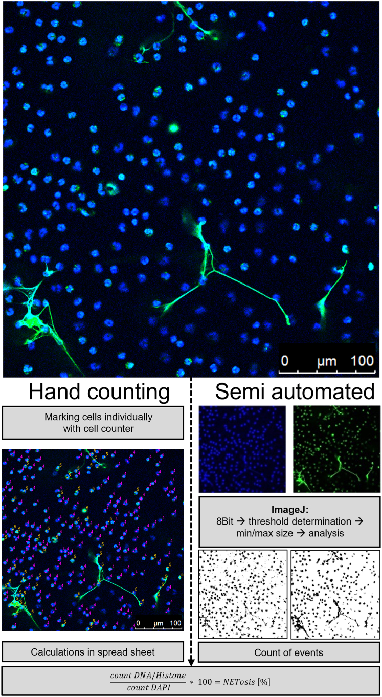 Comparison of NET quantification methods based on immunofluorescence microscopy: Hand-counting, semi-automated and automated evaluations