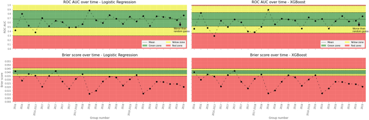 Methods: We developed both parametric (Logistic Regression) and non-parametric (XGBoost) models to predict 30-day mortality after TAVI using data from the Netherlands Heart Registration. The models were trained with data from 2013 to the beginning of 2016 and pre-control charts from Statistical Process Control were used to analyse how time affects the models' performance on independent data from the mid of 2016 to the end of 2019. The area under the Receiver Operating Characteristics curve (AUC) was used to evaluate the models in terms of discrimination and the Brier Score (BS), which is related to calibration, in terms of accuracy of the predicted probabilities. To understand the extent to which refitting the models contribute to the models' stability, we also allowed the models to be updated over time.