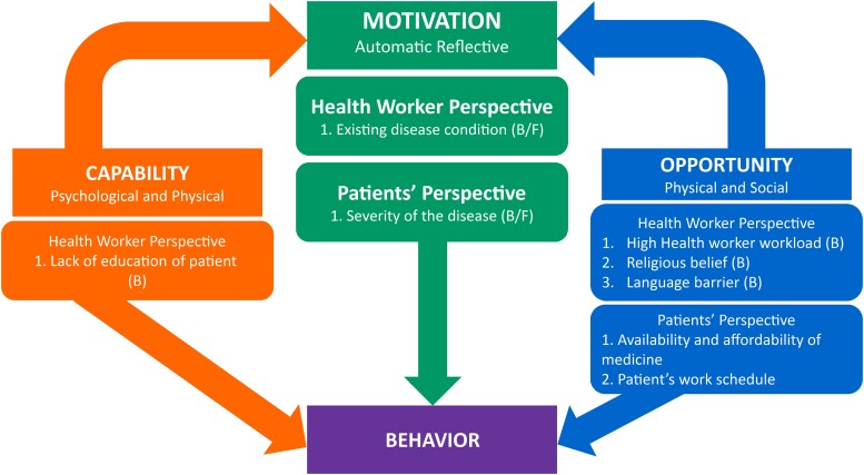 Methods: The study undertook a content analysis of primary, qualitative data collection using in-depth interviews and focus group discussions, informed by the Capability, Opportunity, Motivation (COM-B) theory of behavior, the Theoretical Domains Framework (TDF), and Behavior Change Wheel (BCW) approach, in health facilities (39 health workers) and communities (66 community members) in the Shai-Osudoku District of Ghana.