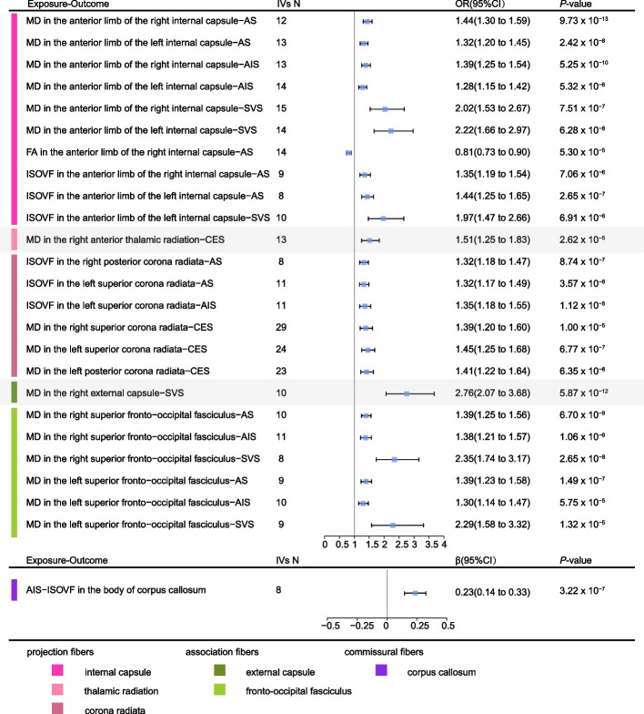 Results: Forward MR indicated 14 IDPs belong to projection fibers or association fibers were associated with stroke. For example, higher genetically determined mean diffusivity (MD) in the right external capsule was causally associated with an increased risk of small vessel stroke (IVW OR = 2.76, 95% CI 2.07 to 3.68, P = 5.87 × 10-12). Reverse MR indicated that genetically determined higher risk of any ischemic stroke was associated with increased isotropic or free water volume fraction (ISOVF) in body of corpus callosum (IVW β = 0.23, 95% CI 0.14 to 0.33, P = 3.22 × 10-7). This IDP is a commissural fiber and it is not included in the IDPs identified by forward MR.