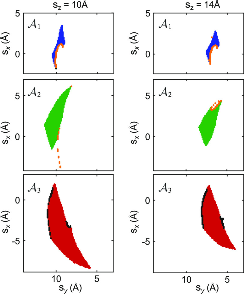 through the s cloud of the three anchor sets at sz = 10 Å (the pink plane in panel (a)).
