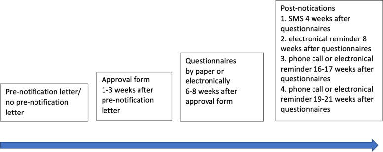 Study design: and settings This long-term follow-up study included 269 adolescents were randomized (1:1) into a pre-notification group (n = 132) and a no pre-notification group (n = 137). The pre-notification letter was sent prior to the approval form and questionnaires. The outcome measures were the response rates to the approval forms and questionnaires and the rate of post-notifications required.